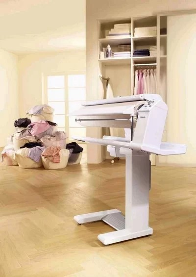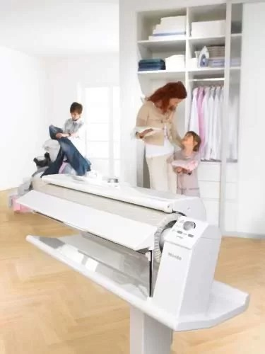 Дизайн машины предусматривает удобный стол для белья под гладильным валом. Это позволяет легко и быстро готовить белье к глажению и сразу же складывать его после процесса. Удобный механизм складывания облегчает хранение прибора, а благодаря 4-м роликам, его можно легко перемещать по дому. Глажение в положении сидя без больших усилий делает процесс глажения менее утомительным.