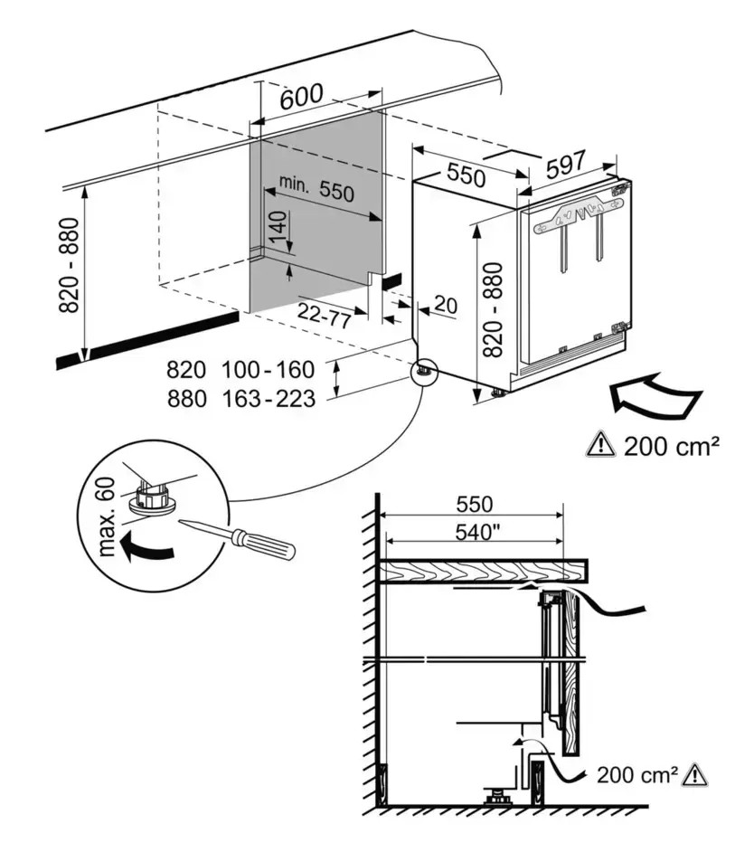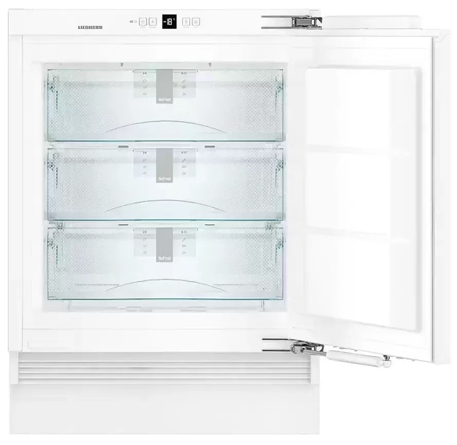 Liebherr SUIGN 1554 — встраиваемая морозильная камера с перенавешиваемой дверцей. Объем 95 литров позволяет долговременно хранить значительные запасы. Жесткое крепление дверцы door-on-door способствует надежности конструкции и позволяет открывать дверцу на угол 115°. Высота 82 см позволяет установить ее под столешницей. Производительность замораживания составляет 11 кг продуктов в сутки. Если произошло отключение электропитания, продукты сохранят свое качество в течение 15 часов с помощью аккумуляторов холода. О том, что срок хранения заканчивается, предупредит FrostControl.