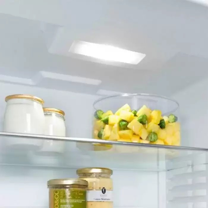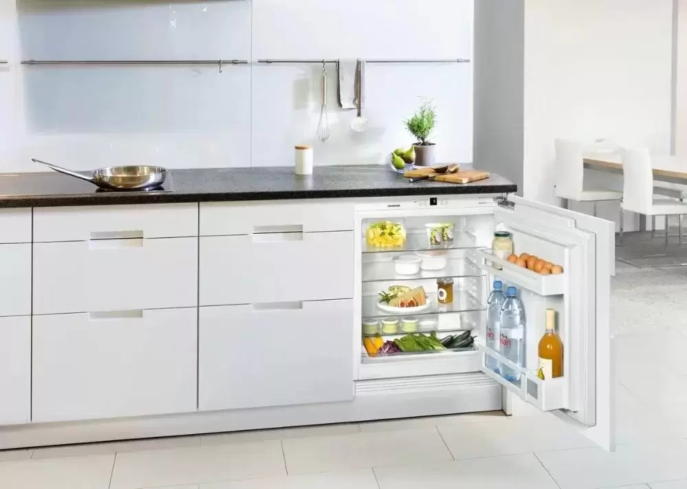 Холодильник без морозильника имеет правый дверной упор, который при необходимости можно перенавесить. Для навески декоративного мебельного фасада используется жесткое крепление по системе door on door, обеспечивающее прочность конструкции и широкий угол открывания дверцы 115°. Вентиляция производится через цоколь. Цокольная панель Vario позволяет удобно встраивать устройство в кухонную мебель, изменяя его высоту и глубину. Модель с одной дверцей и автоматической системой размораживания имеет общий объем 141 литр: продукты можно разместить на 4 полках из закаленного стекла, три из которых регулируются по высоте. Имеется небольшой контейнер для хранения фруктов и овощей. На дверце располагаются две регулируемые полки для бутылок и для консервов и лоток для яиц. Перед загрузкой в холодильник большого количества продуктов рекомендуется использовать режим суперохлаждения SuperCool, заблаговременно понижающий температуру в камере. Регулировка температуры в камере производится в пределах от +2°C до +9°C. О неплотно закрытой дверце предупреждает световая и звуковая сигнализация. Бесшумную комфортную работу гарантирует низкий уровень шума 38 дБ.