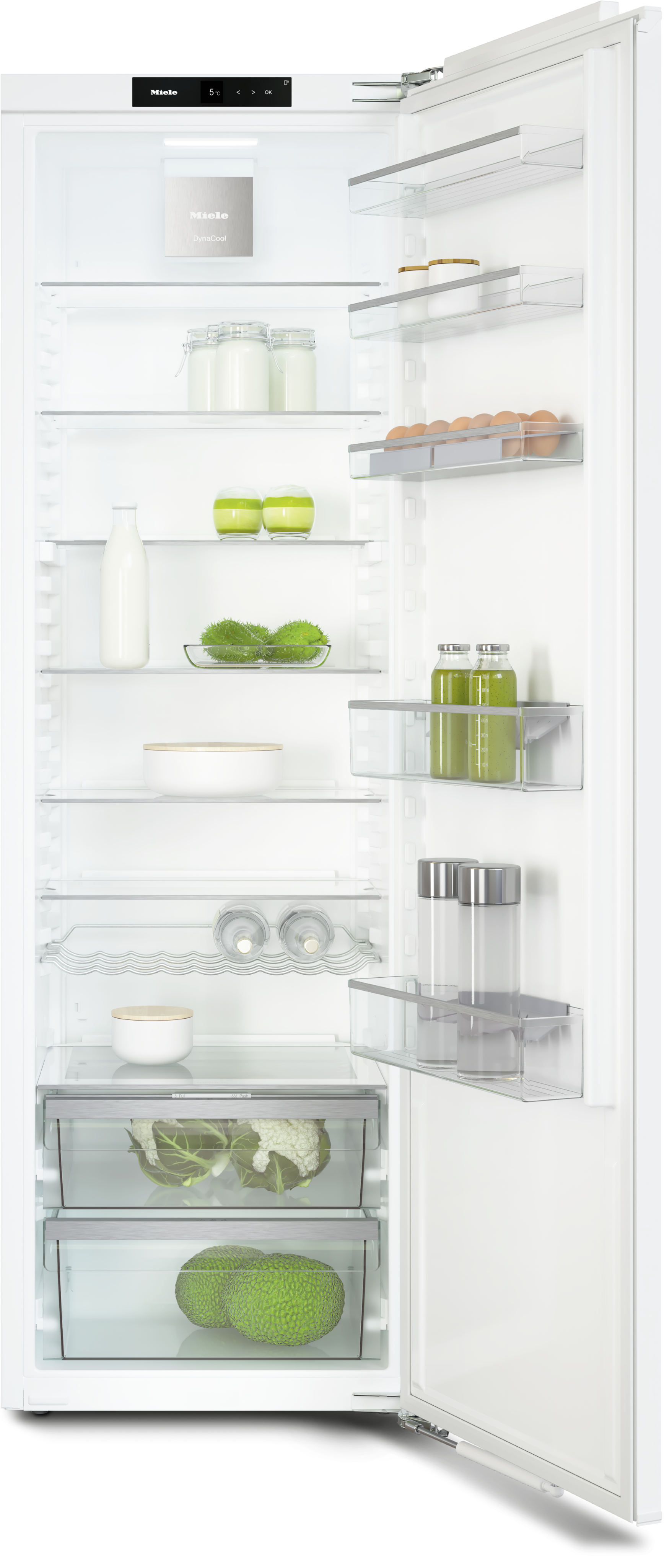 Система сохранения свежести MasterFresh в холодильниках Miele предназначается для хранения продуктов в морозильной камере при минимальной температуре без замораживания. Влажность воздуха также можно регулировать, чтобы создать оптимальные условия для хранения зелени, овощей, фруктов, мыса и рыбы, сыров и других молочных продуктов. Продукты для хранения помещаются в специальные контейнеры MasterCool, позволяющие в три раза дольше сохранять их свежесть, а также все витамины и минералы. Контейнеры с прозрачной передней частью легко выдвигаются для удобного доступа к продуктам.