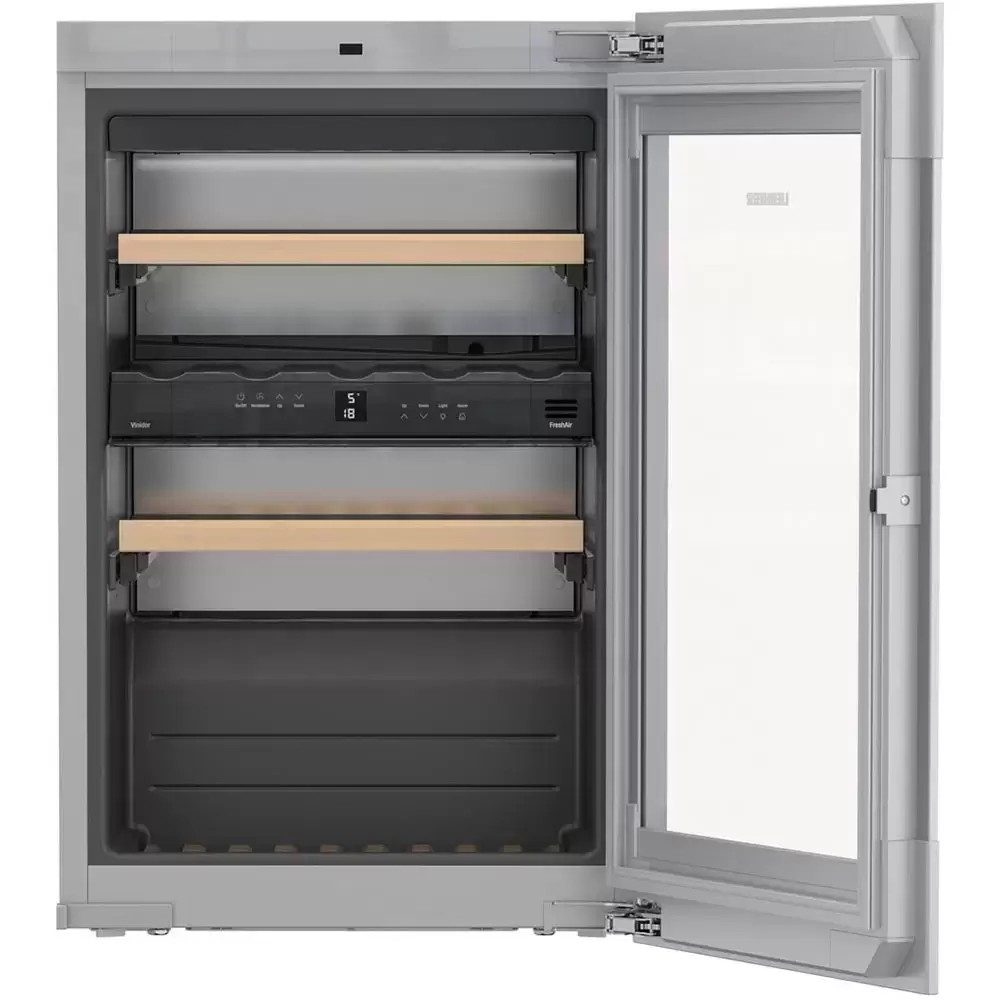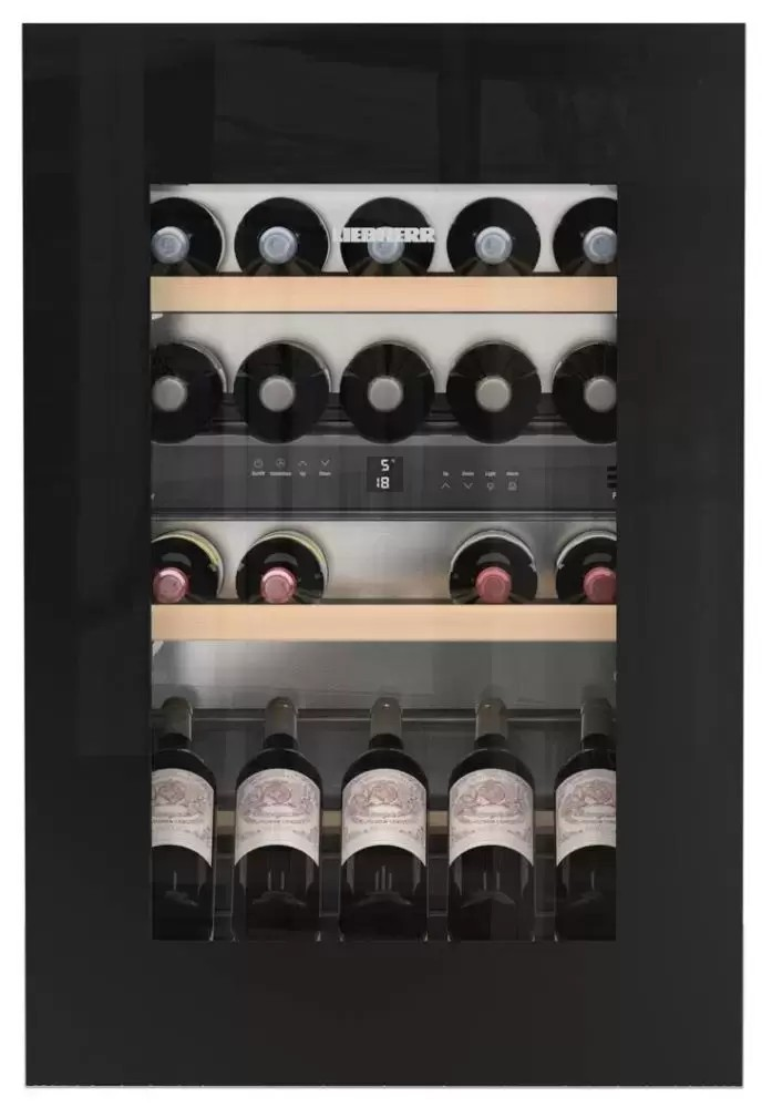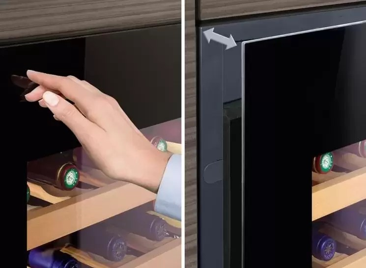 Модель высотой 90,6 см в стильном черном корпусе при встраивании не нуждается в навешивании декоративного фасада. Она оснащена регулируемыми ножками для выравнивания на месте установки. Дверные петли расположены справа, но могут быть перенесены на левую сторону. Экономичность прибора удостоверяет класс энергопотребления A. Шкаф можно устанавливать в закрытых помещениях при температуре от +10°С до +32°С в соответствии с климатическим классом SN. Тонированный стеклопакет в дверце надежно защищает вино от воздействия УФ-излучения. Для размещения бутылок выбран наиболее безопасный материал — натуральное дерево. Две полки можно выдвинуть на телескопических направляющих, что значительно облегчает доступ к содержимому. Модель поддерживает широкий диапазон температур в камере — от +5°C до +20°C. Устранить посторонние запахи поможет фильтр из активированного угля. Щадящая светодиодная подсветка отличается функцией плавного изменения яркости. Для регулировки температуры предназначается сенсорная панель управления с ЖК-дисплеем и цифровой индикацией. Предусмотрена сигнализация неисправности и неплотно закрытой двери, а также защита от детей.